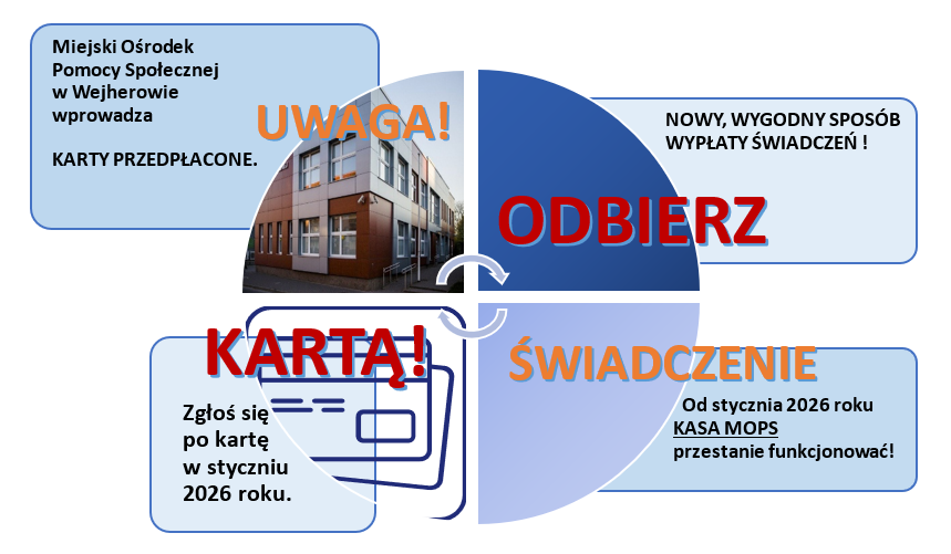 Od stycznia 2026 r. wypłaty świadczeń w kasie MOPS Wejherowo zostają zakończone. Osoby, które dotychczas odbierały świadczenia gotówkowo (również jednorazowo), będą otrzymywać środki za pomocą kart przedpłaconych.